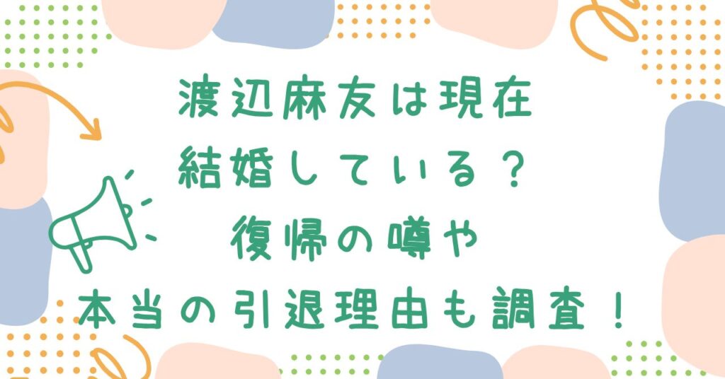 AKB48の総選挙で、1位を獲得したこともある渡辺麻友(まゆゆ)さん。 アイドルとしてノースキャンダルは当たり前、アイドルとして完璧で周りからも評価されていたまゆゆですが、 急に引退した記憶があります。 そのまゆゆは現在結婚はしたのか?復帰の噂や... -