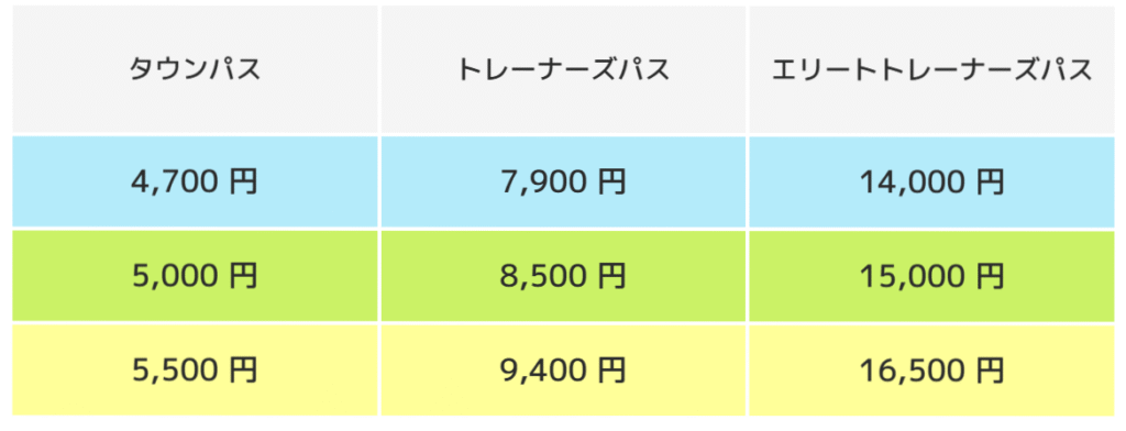 マックスの金額だと、一番高いエリートトレーナーズパスで16,500円!だいぶお値段に差がありますので、考えどころですね!